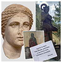 Φαίνεται ότι η χριστιανορθόδοξη τρομοκρατία δεν έχει εγκαταλείψει τις μεθόδους εξόντωσης του ελληνισμού, μόνο που τώρα δεν χαράσσει το σήμα του θανάτου πάνω στα πρόσωπα των αγαλμάτων, αλλά καταστρέφει με αλυσοπρίονο οτιδήποτε μπορεί να θυμίσει τον αυθεντικό εθνικό ελληνισμό.